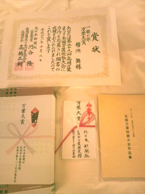 第29回全国万葉短歌大会の表彰式に出席するため、明日から富山に行って来ます。短歌で表彰されるのは初めてなので、今からとても緊張しております。表彰式の後にコンサートなどの催しもあるみたいですが、人がたくさんいる場所、大きな音が出る場所には長居ができないものですから、表彰式だけの参加になります。佐佐木先生や辺見先生のお話を聞くことができないのは残念ですが、かわりに金沢まで足をのばして、ちょっとした療養をしてきたいと思っております。
