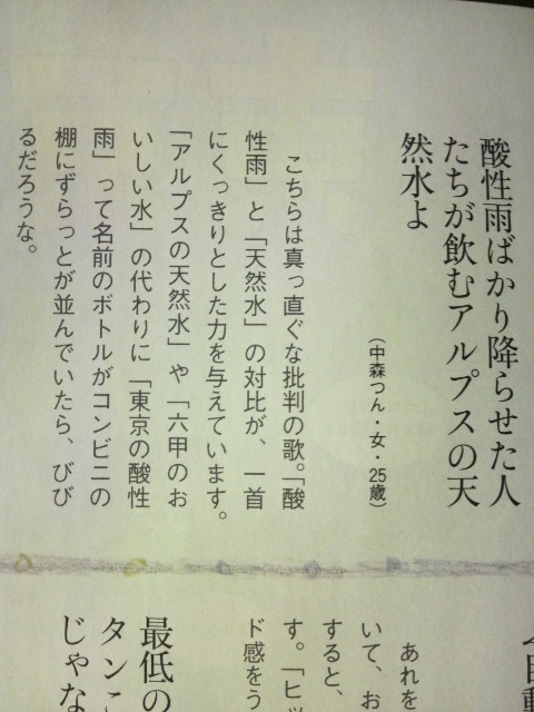 「こちらはまっすぐな批判の歌。「酸性雨」と「天然水」の対比が、一首にくっきりとした力を与えています。「アルプスの天然水」や「六甲のおいしい水」の代わりに「東京の酸性雨」って名前のボトルがコンビニの棚にずらっと並んでいたら、びびるだろうな。」